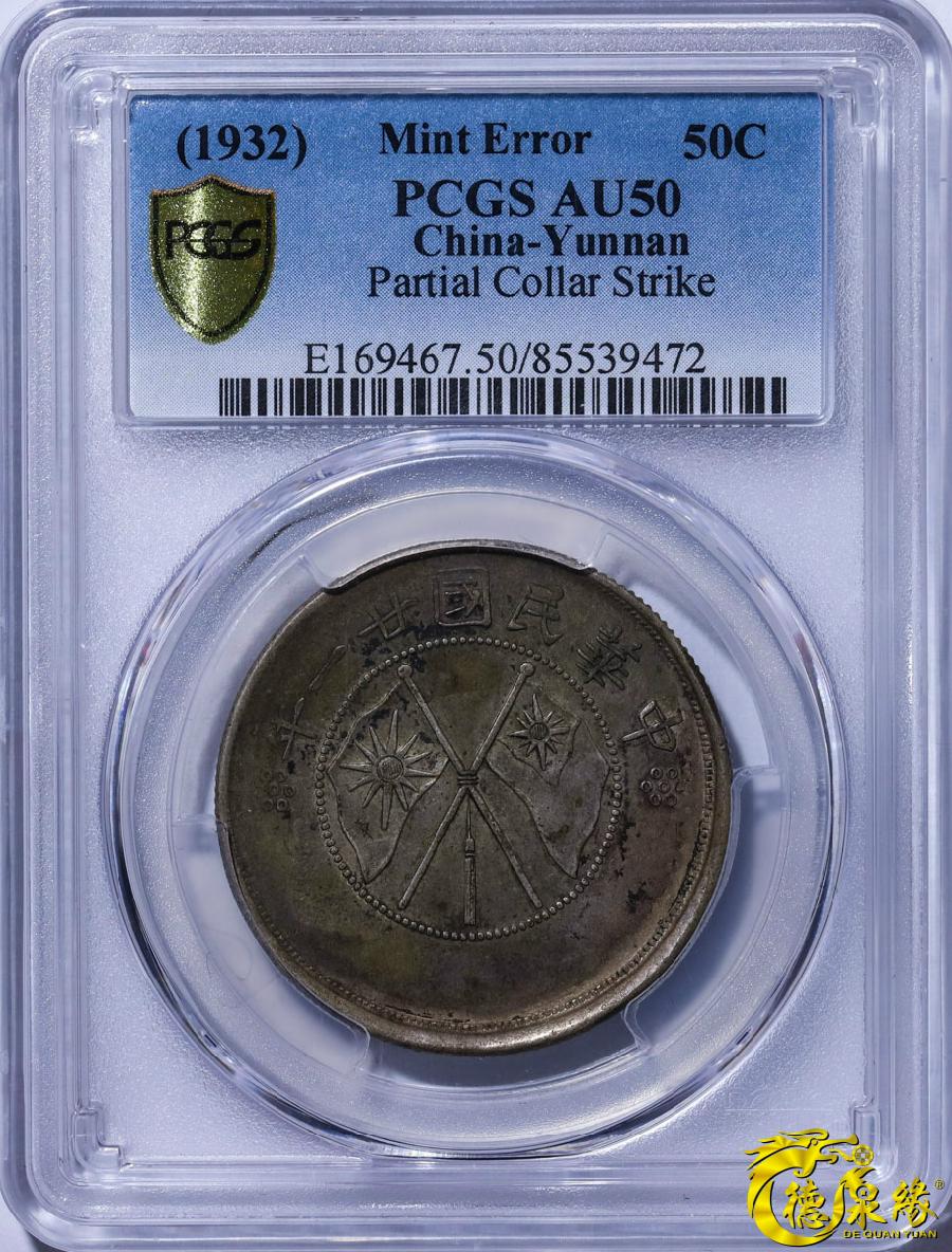 中华民国二十一年云南省造双旗半圆 PCGS AU50 85539472 偏打错版